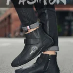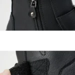 Elevate your everyday look with this sleek, low-profile ankle boot, designed for easy wear and contemporary urban appeal. Featuring a dark, matte grey leather-look upper with distinctive center seam stitching and a subtle, concealed elasticized band closure that runs along the front, these boots offer a clean, streamlined finish. The thick, geometric rubber outsole provides excellent stability, superior comfort, and a bold, modern edge, complete with a “FASHION STYLE” accent on the heel. Effortless to pull on, this boot is a versatile staple for any casual or smart-casual outfit.