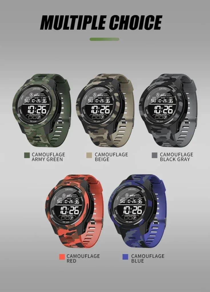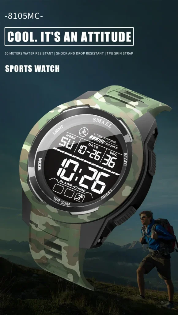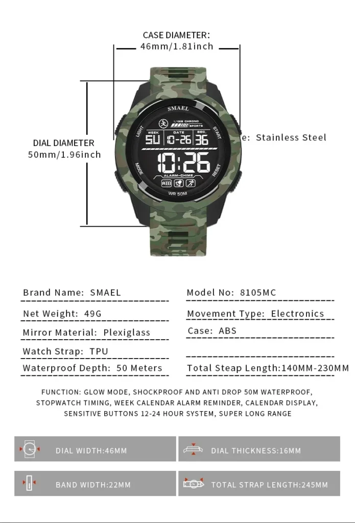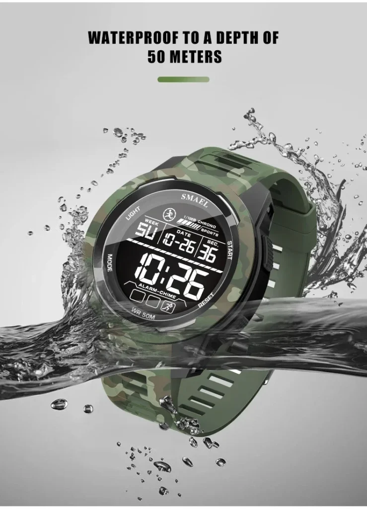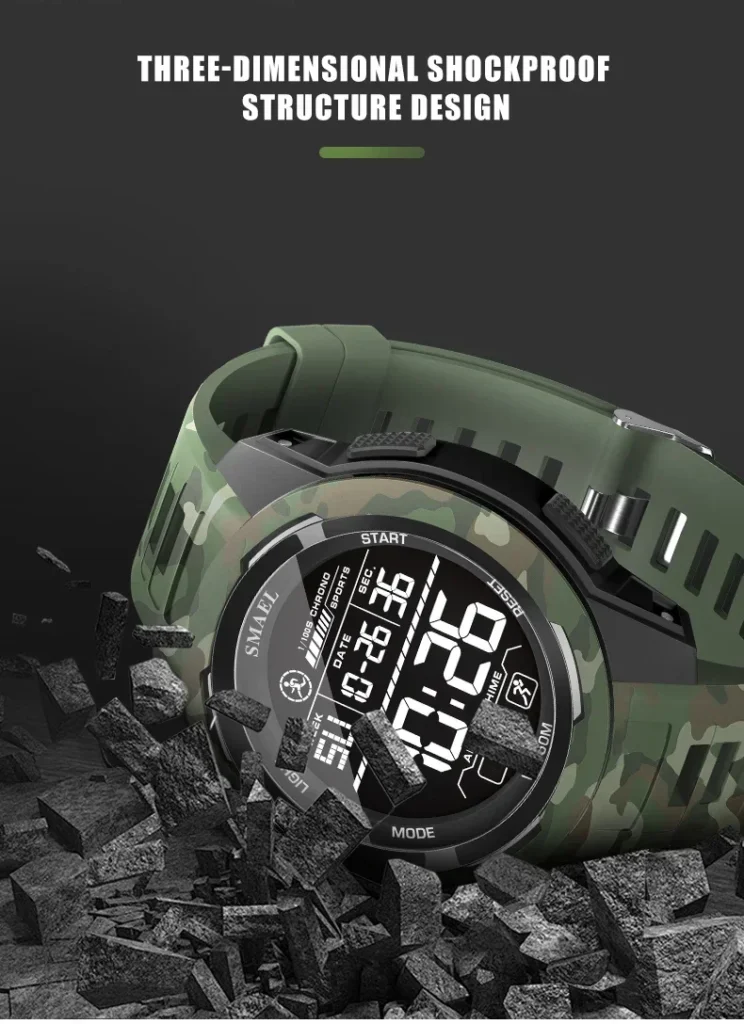 Engineered for the field and the urban tactical environment, the SMAEL 8105C is a high-performance men’s sports watch that flawlessly merges rugged military utility with essential digital functionality. Constructed to withstand extreme conditions, this timepiece features a robust, heavy-duty housing designed to deliver S-Shock resistance against impact and vibration, ensuring reliability where it matters most.