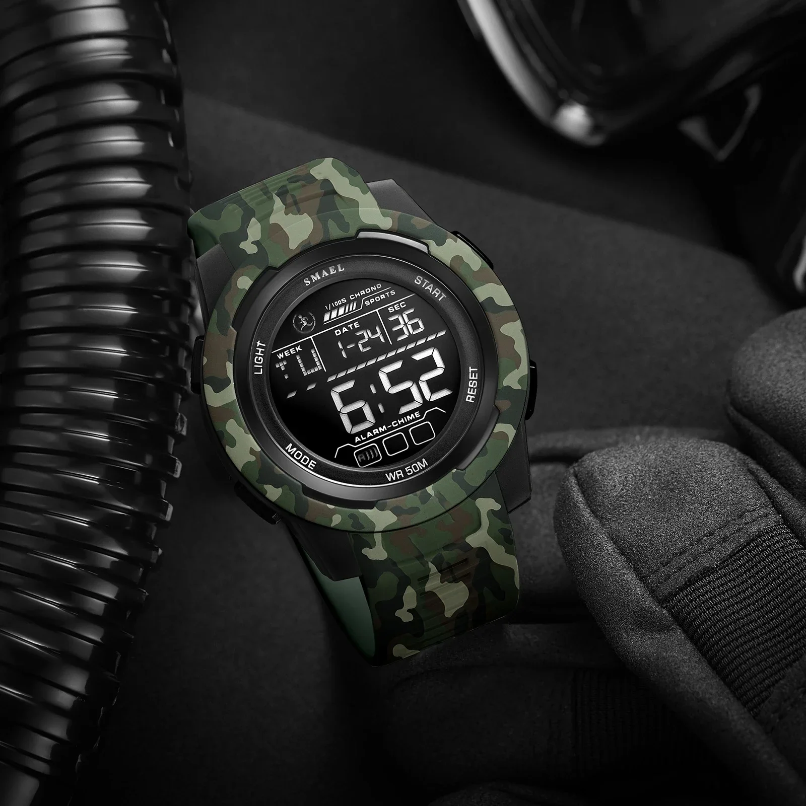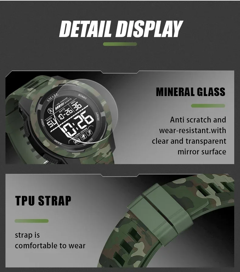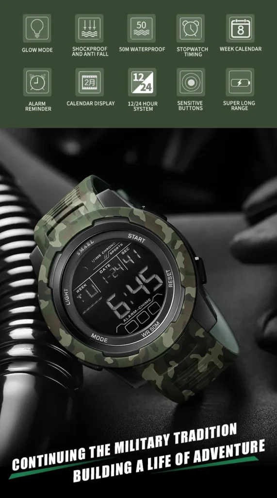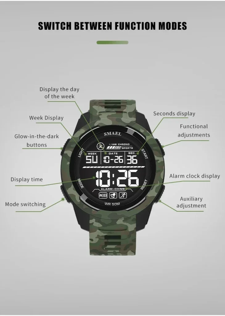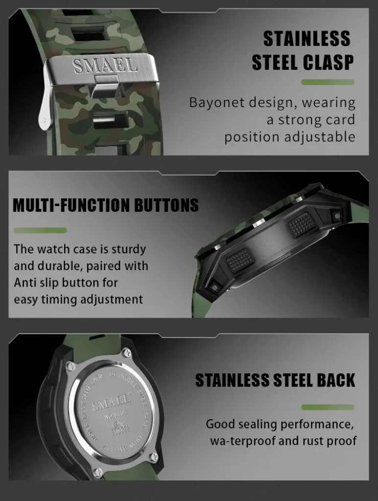 Engineered for the field and the urban tactical environment, the SMAEL 8105C is a high-performance men’s sports watch that flawlessly merges rugged military utility with essential digital functionality. Constructed to withstand extreme conditions, this timepiece features a robust, heavy-duty housing designed to deliver S-Shock resistance against impact and vibration, ensuring reliability where it matters most.