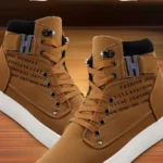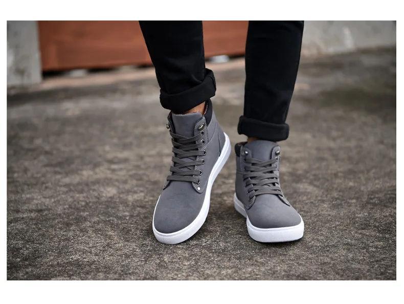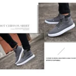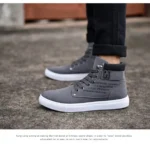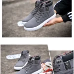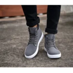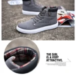 Blending the comfort of a sneaker with the style of a boot, this high-top shoe is perfect for transitional weather. It features a durable grey canvas upper with a clean, white contrast sole that provides a sporty, elevated look. The interior is lined with soft, warm plaid fabric, offering a comfortable feel and a cozy touch. Detailed with metal eyelets, rugged laces, and branded side panel text (“FASHION SHOES TALL & FASHION”), this boot delivers a stylish, everyday option that is both casual and refined.