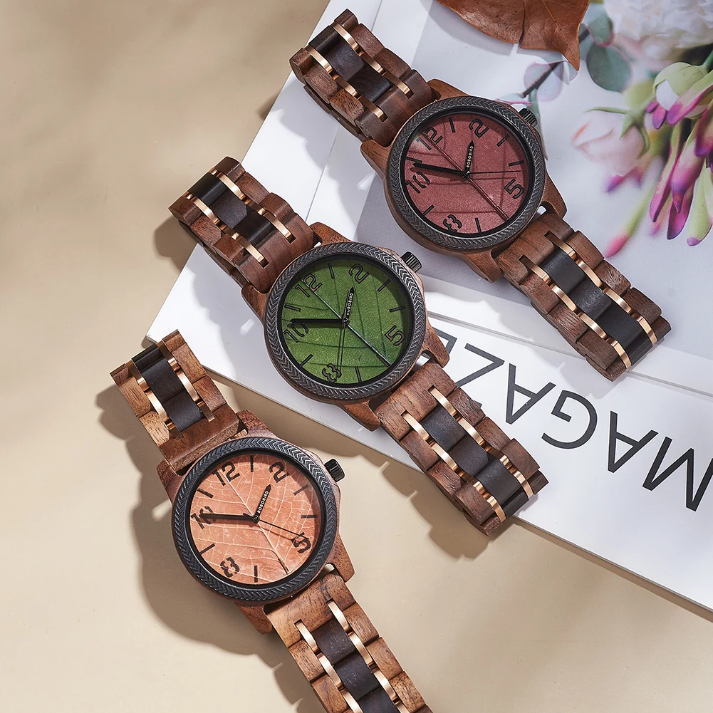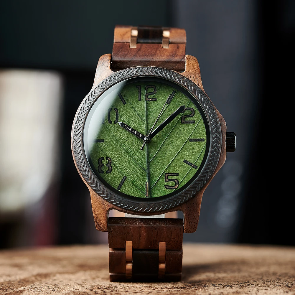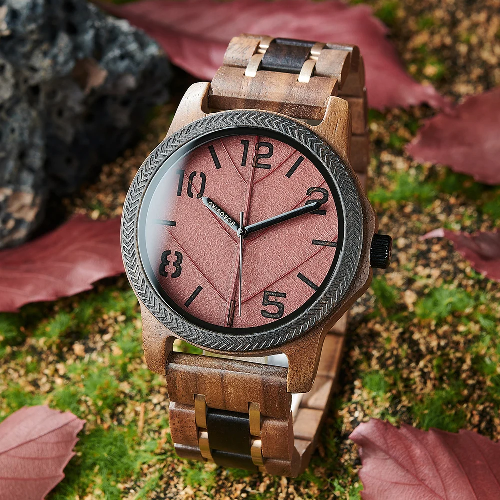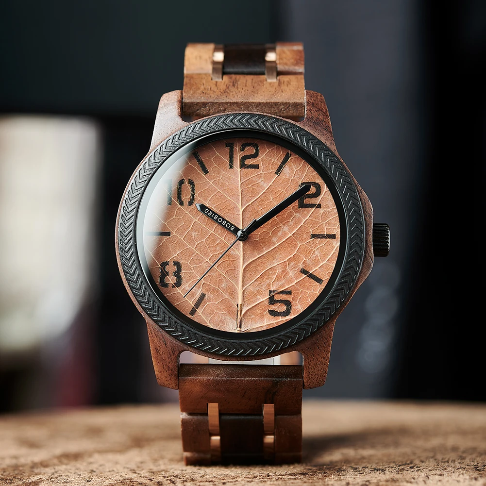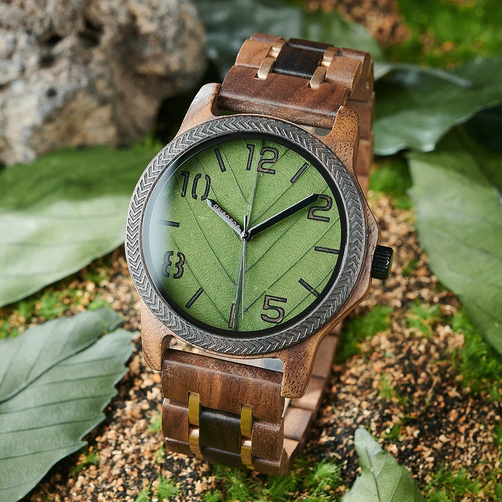 Design Aesthetic: Unique, naturalist design featuring a decorative Leaf Dial combined with a modern Digital Display.Movement: Reliable Japanese Quartz Movement for precision timekeeping.Materials: Exquisitely crafted from two-tone natural woods: Walnut + Ebony. Customization: Available for OEM Customized Dropshipping, ideal for unique retail concepts.