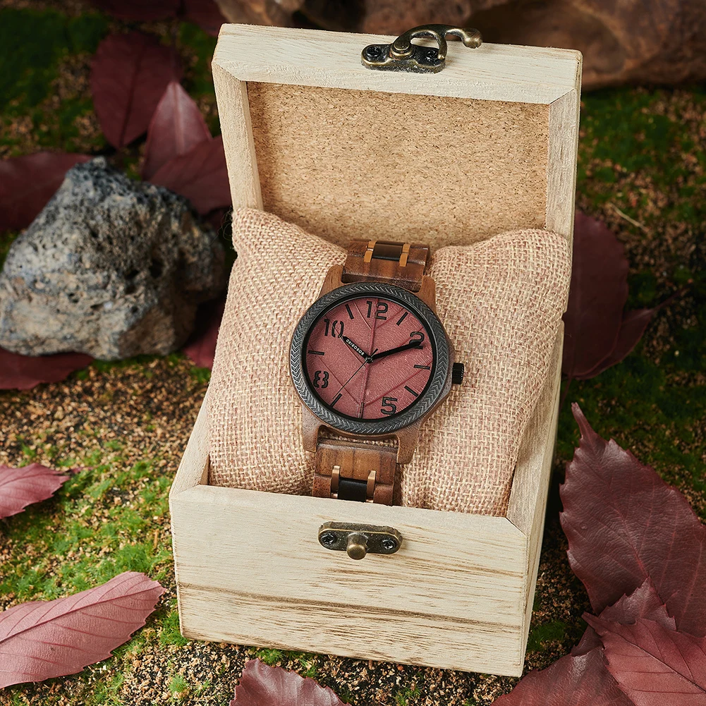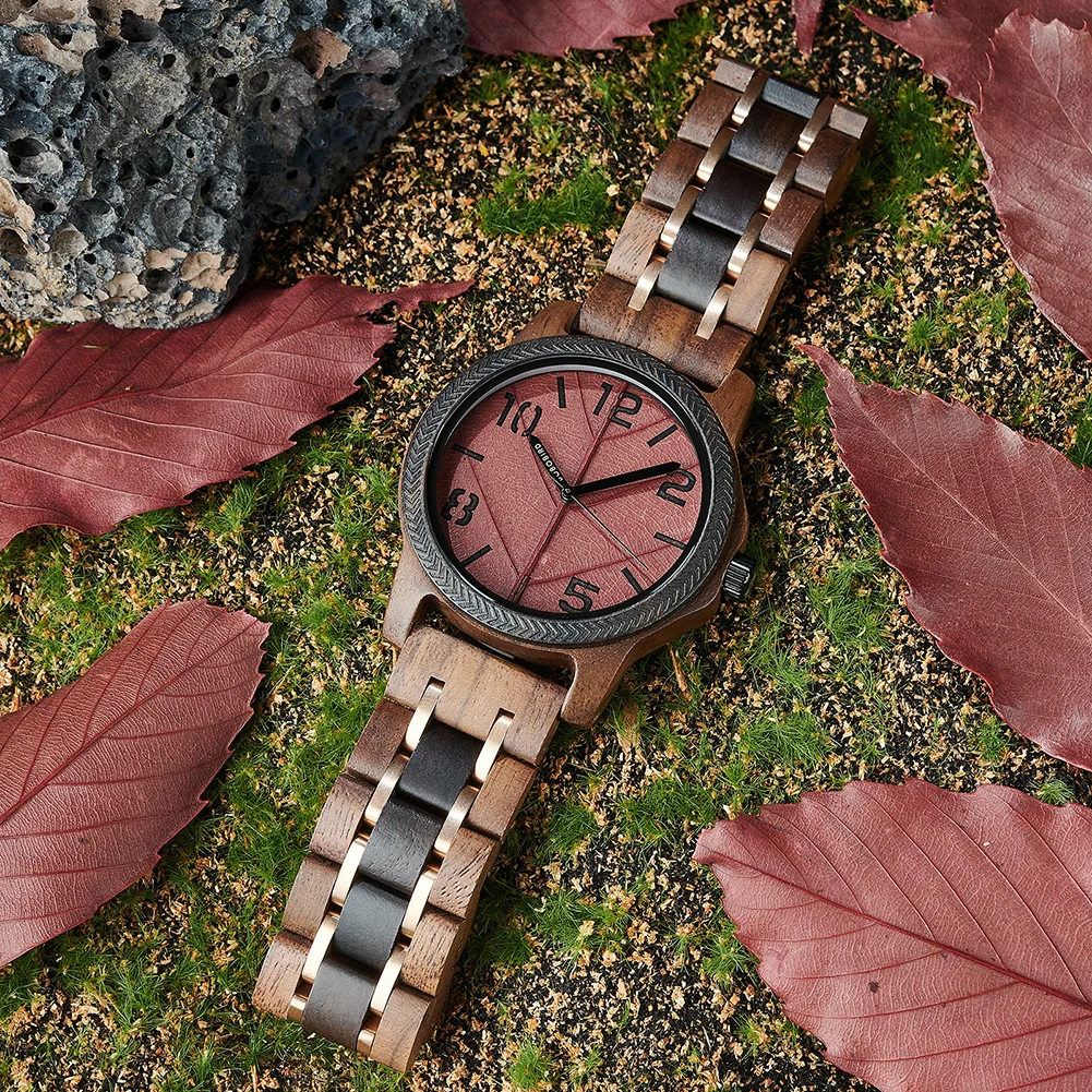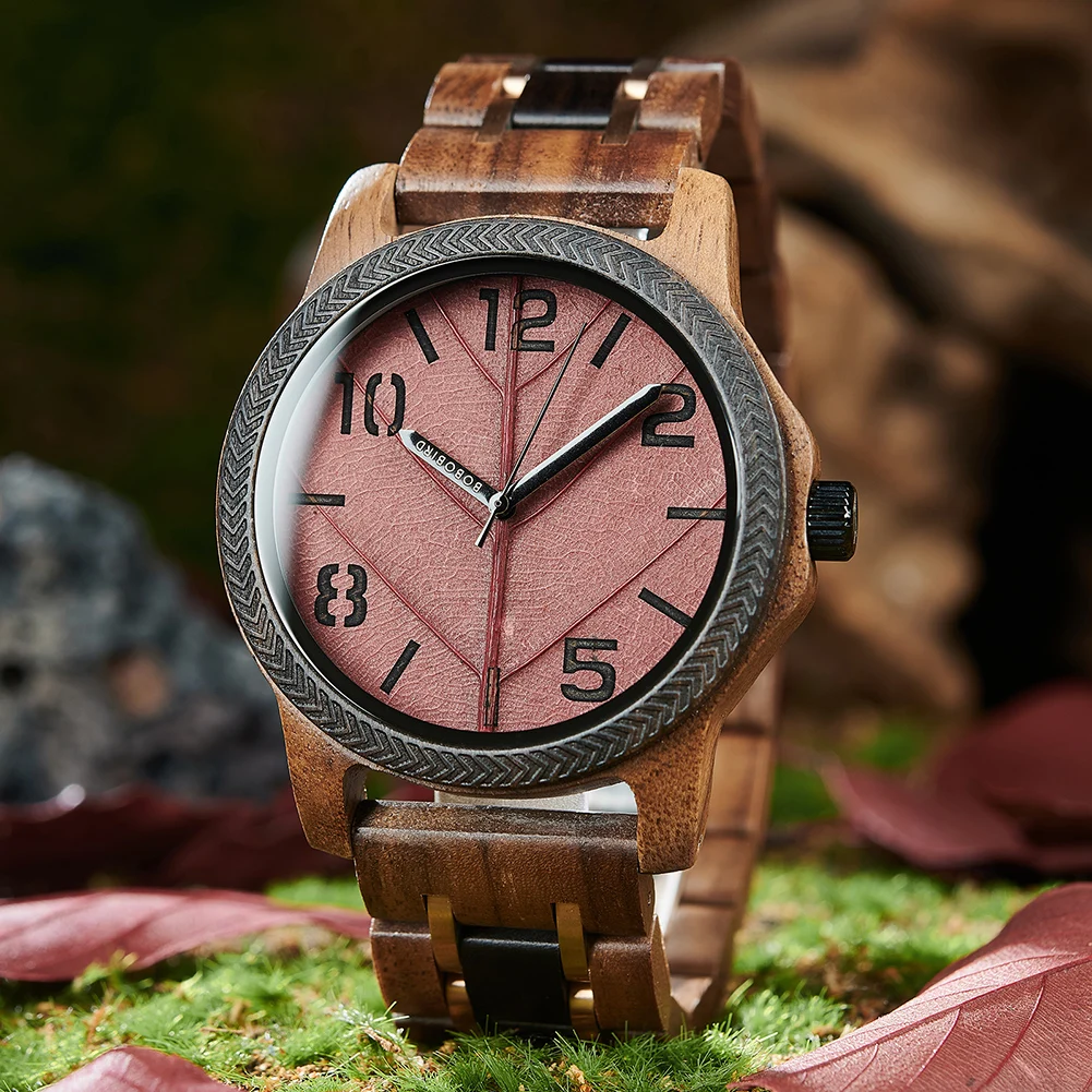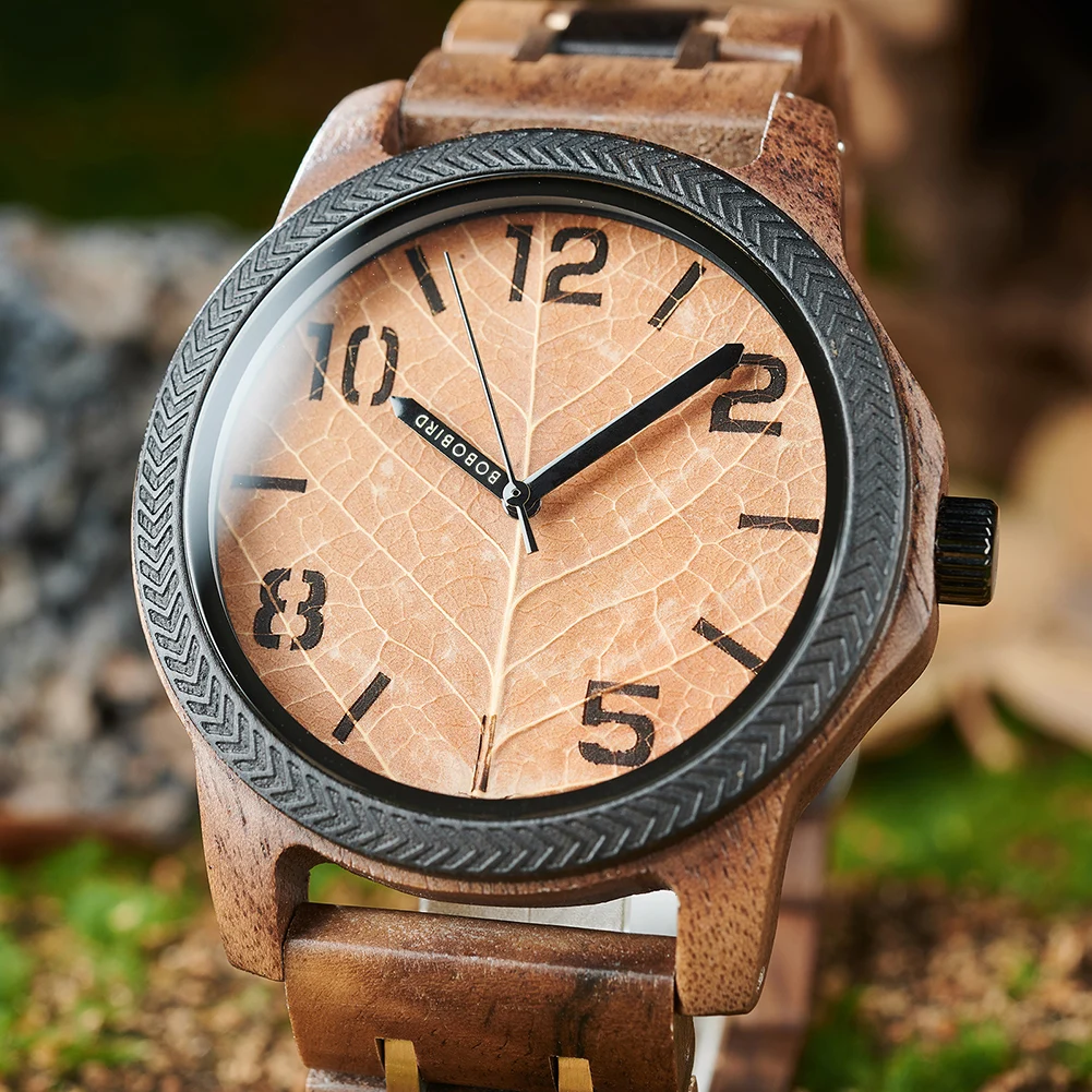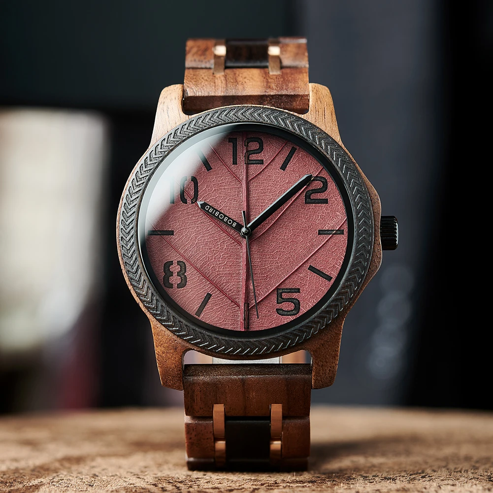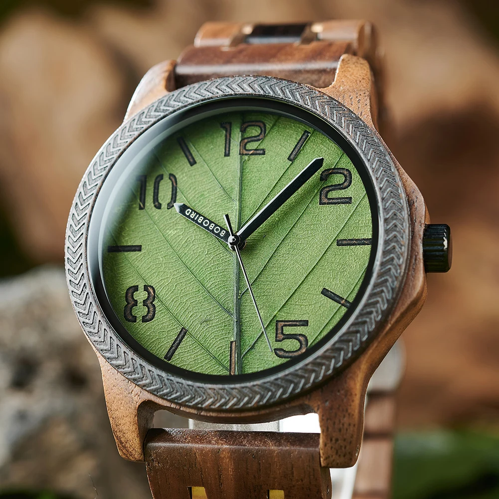 Design Aesthetic: Unique, naturalist design featuring a decorative Leaf Dial combined with a modern Digital Display.Movement: Reliable Japanese Quartz Movement for precision timekeeping.Materials: Exquisitely crafted from two-tone natural woods: Walnut + Ebony. Customization: Available for OEM Customized Dropshipping, ideal for unique retail concepts.