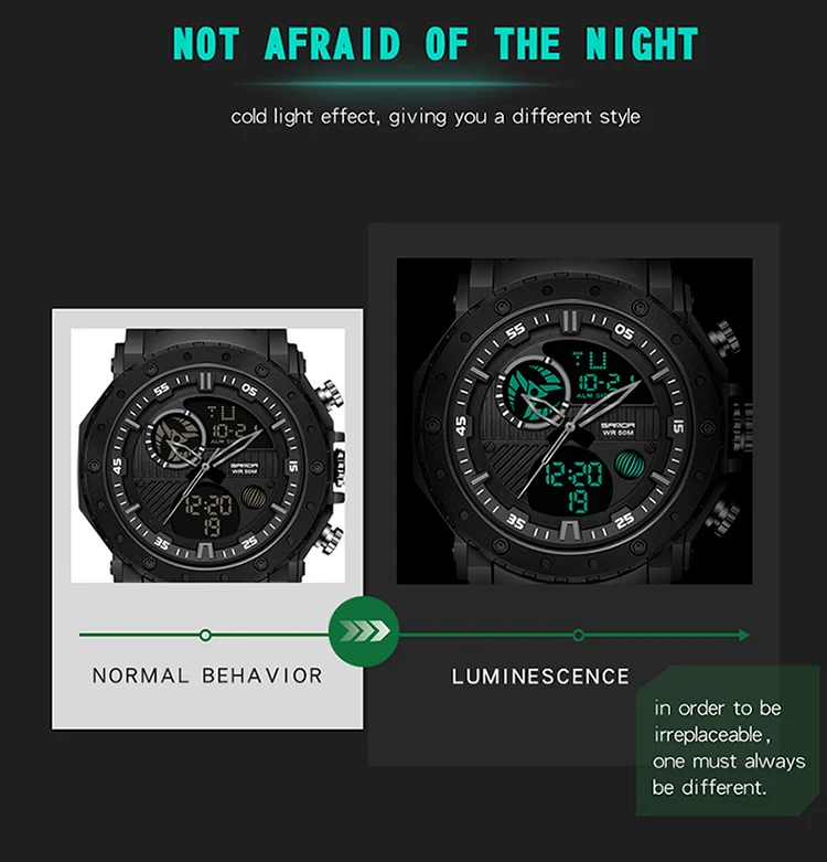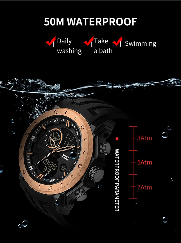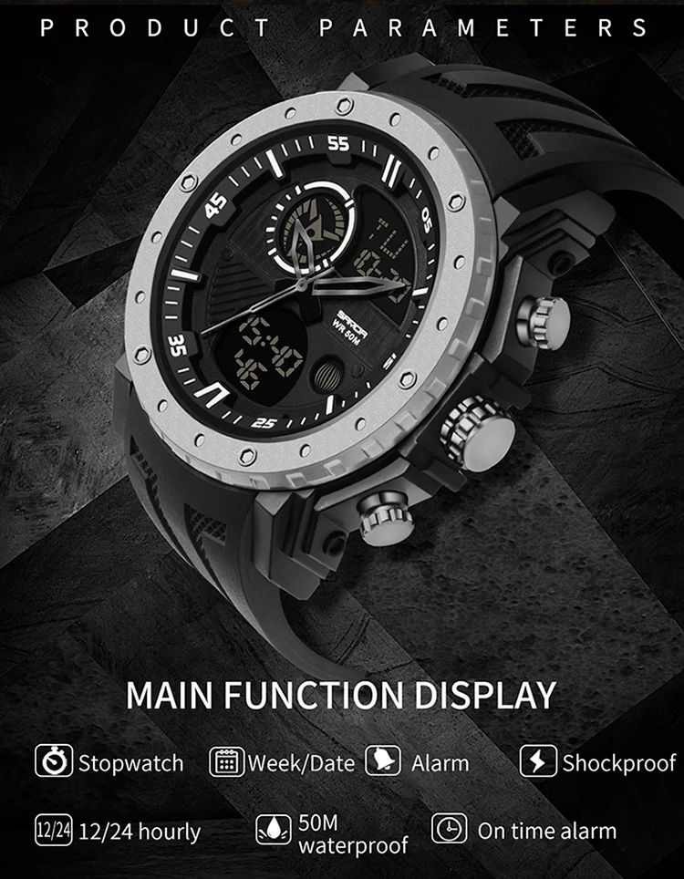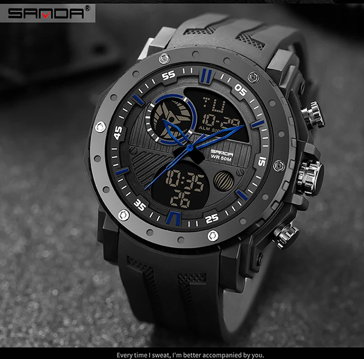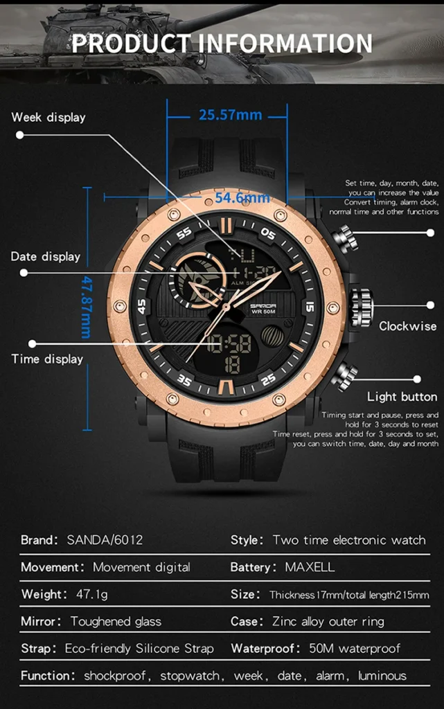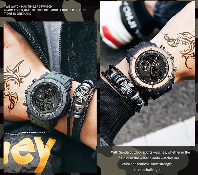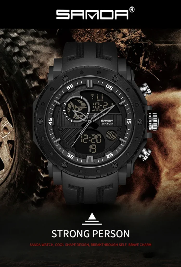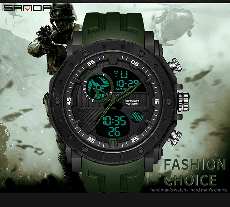 Digital Luxury Meets Military UtilityEngineered for the demanding lifestyle, the SANDA Luxury Brand Military Sports Watch perfectly blends high-end Fashion & Casual appeal with rugged, tactical performance. This men’s timepiece is a statement of modern power, featuring the essential S-Shock construction designed to provide superior resistance to impacts, ensuring reliability from the boardroom to the back trails.Encased in durable ABS material and secured by a comfortable, resilient Rubber band, this watch offers an undeniable, high-impact aesthetic. Its large, commanding presence (Dial Diameter: $54 \text{mm}$) is complemented by a versatile Digital display and a genuine Waterproof capability. It’s the ultimate choice for the man who seeks a Relogio Masculino that delivers both luxury-level style and uncompromising military-grade endurance.Key SpecificationsBrand & Style: SANDA Luxury Brand blending Fashion, Casual, and Sport aesthetics.Core Durability: Features S-Shock resistance for high-impact protection.Functionality: Essential Digital Watch display with guaranteed Waterproof performance.Materials:Case Material: High-strength ABSBand Material: Durable and comfortable RubberDimensions (Commanding Presence):Dial Diameter: $54 \text{mm}$ ($2.13 \text{ in}$)Case Thickness: $17 \text{mm}$ ($0.67 \text{ in}$)Band Width: approx $25 \text{mm}$ ($9.44 \text{ in}$)Max Perimeter: $235 \text{mm}$ ($9.25 \text{ in}$)