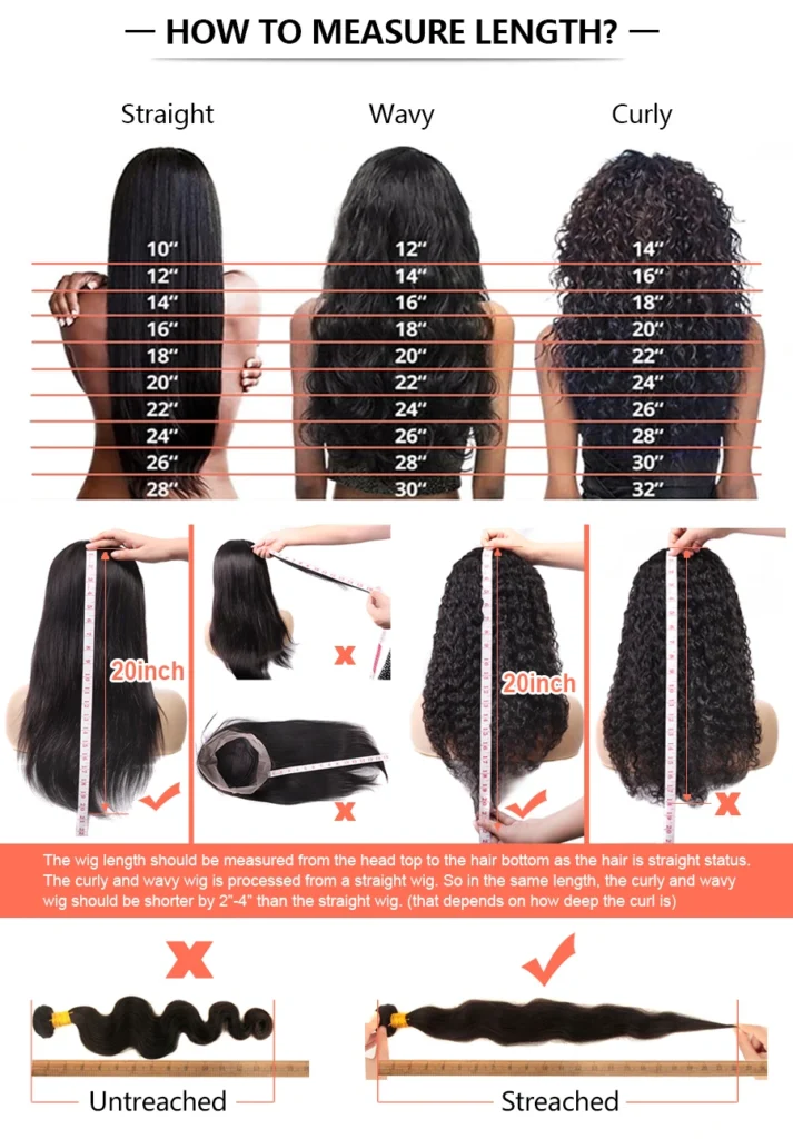 Measuring Length: For wavy and curly hair, you must stretch it to straight before measuring the hair from top to the end.