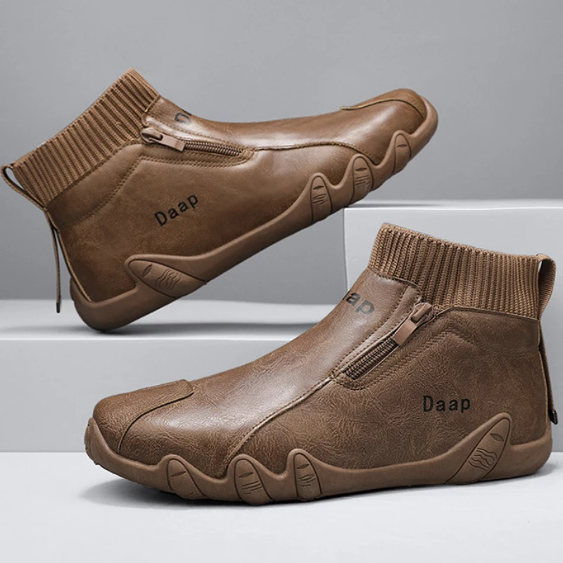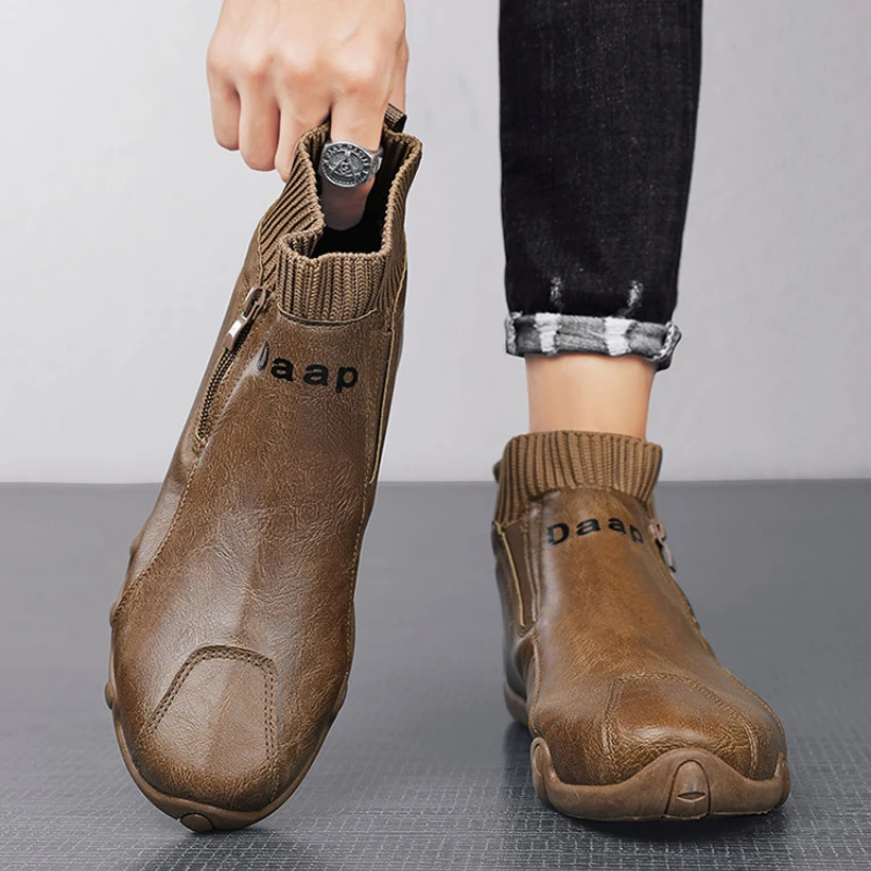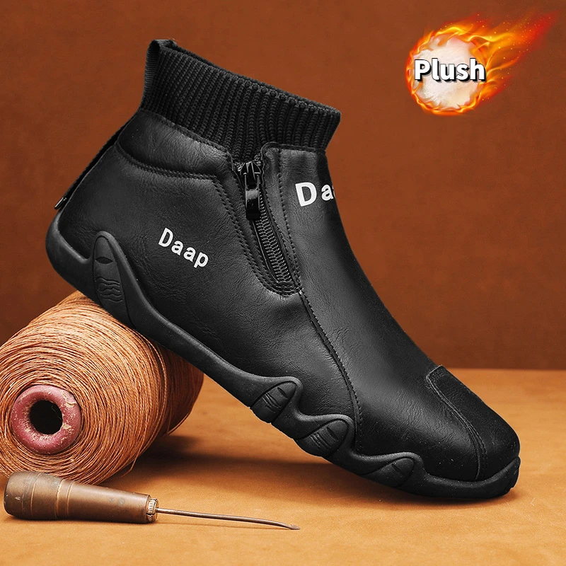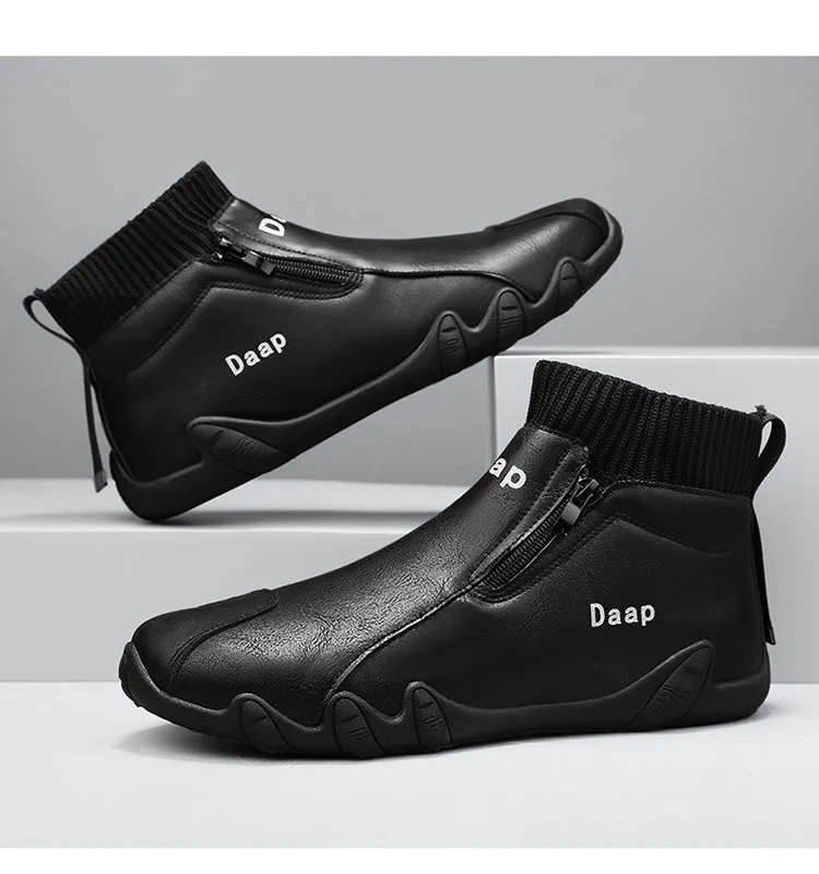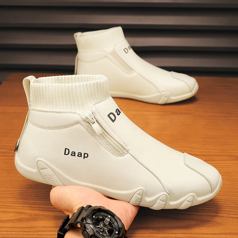 Step up your casual style with these modern high-top sneaker boots, featuring a sleek leather-look upper and a flexible knit sock collar for ultimate comfort. Designed for convenience, the sturdy side zipper makes them effortless to slip on and off while ensuring a secure fit around the ankle. The durable, sporty sole provides excellent traction and support, making them perfect for all-day urban wear. Detailed with unique ‘Daap’ lettering and precision stitching, these boots blend rugged durability with a trendy silhouette. Choose your perfect match from our three versatile color options: Classic Black, Rich Brown, and Crisp White.